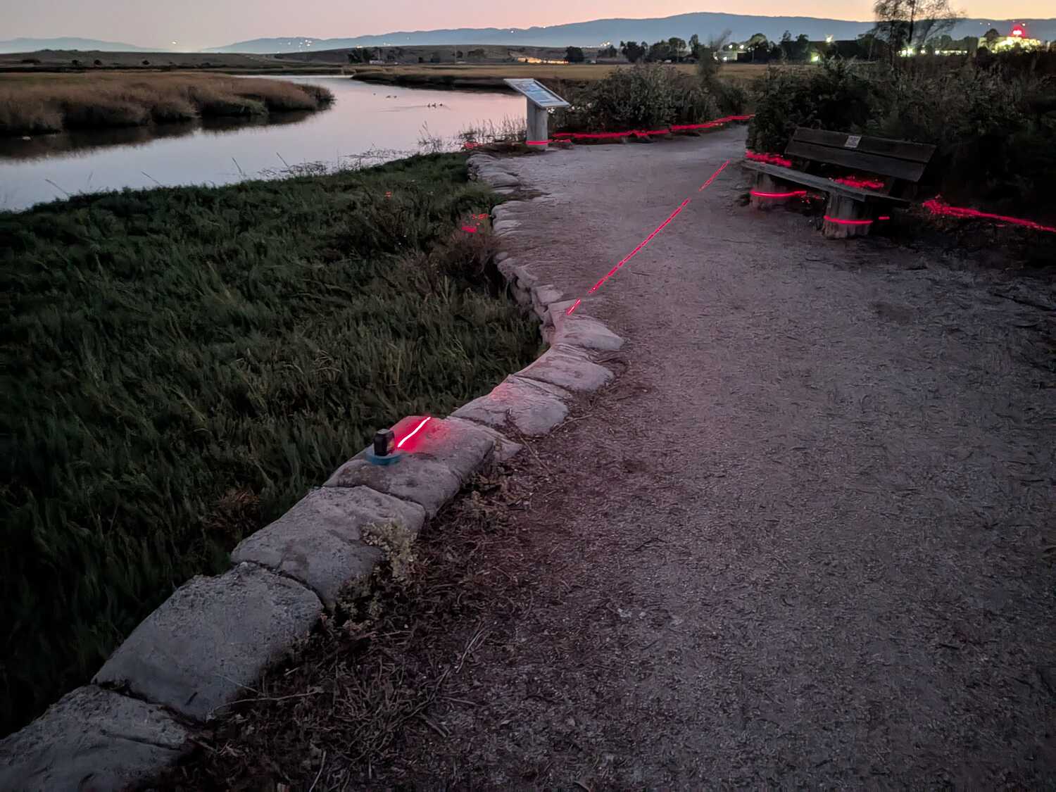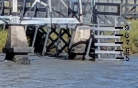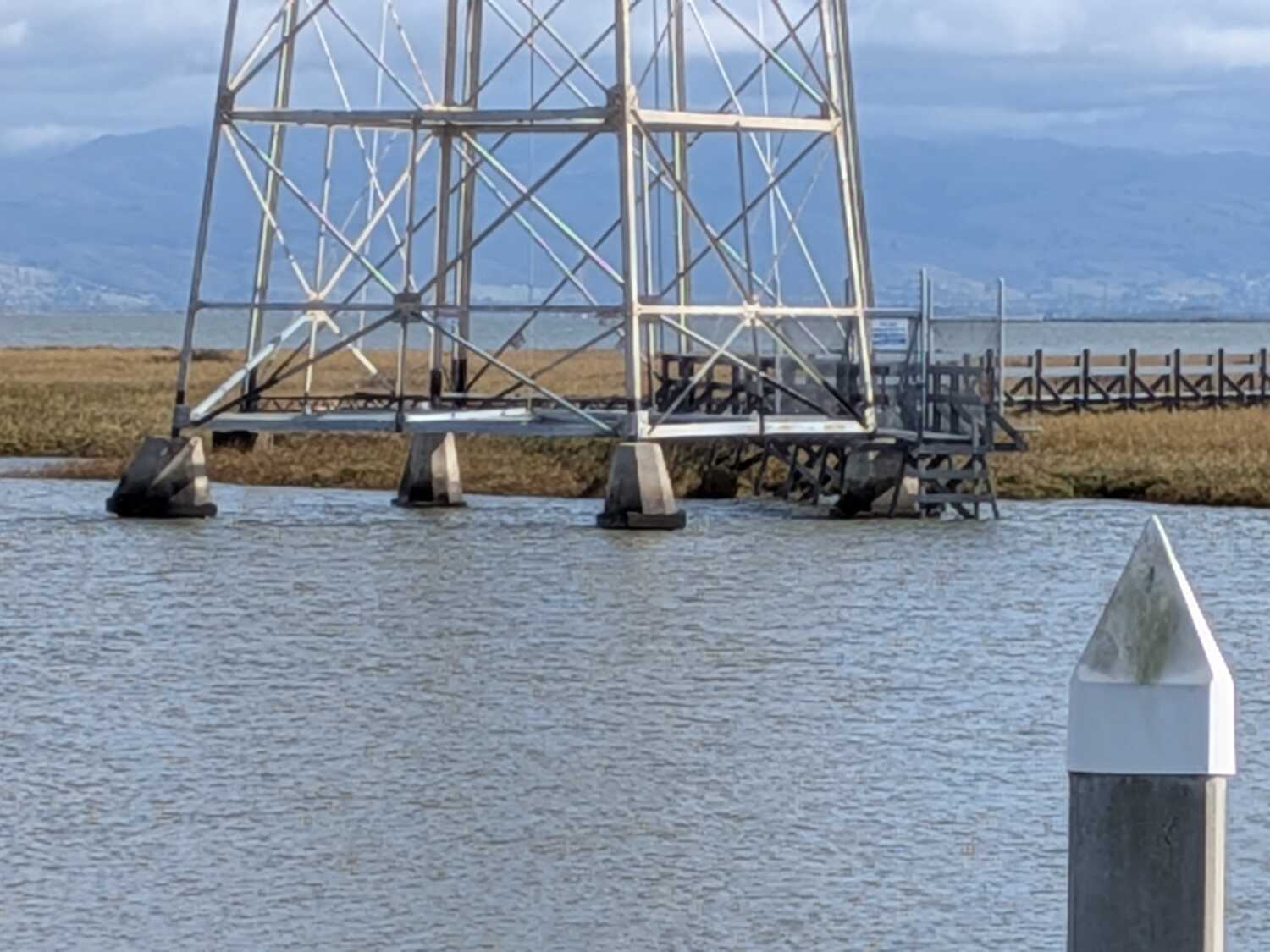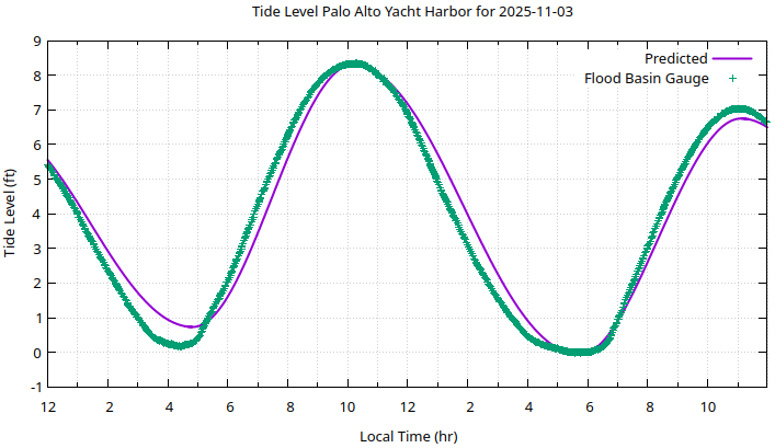 Ken Poulton and I started tracking the tide levels at Palo Alto in August of 2025 by taking photos. Yomi Matsuoka joined in on the tide characterisation effort by taking pictures and giving them to Ken and me. Ken saw that the ladder at the base of the power lines tower is a "ready-made gauge". This breakthrough enabled us to easily assign heights to the observations. Ken was the first to plot these observations with the xtide predictions and determine that a better scale was to assign 9 to the top step rather than 8. My wife and I found Bench Mark 4525 C 1976 while on a walk on October 26, 2025. Two days later, I swam my board to the ladder and measured the step spacing on the ladder to be 15 inches. On October 29, 2025, I inquired at the Palo Alto Baylands Ranger Station to find out if there was a tidal gauge on a pier or pole in the water somewhere that we could use to determine the tide level. To my delight, the lead ranger showed me the Creek Monitor and Camera page on her computer. She also told me that the tide level reported in the Creek Monitor image was offset by two feet from the actual tide level. That same day, I used a laser level and a tape measure to calibrate the tide level relative to the Bench Mark 4525 C 1976. I computed the offset from the Flood Basin Gauge to be 3.22 ft rather than the 2 ft that the lead ranger told me. On November 5, 2025, I remeasured the offset to be 3.21 ft. It could be the real offset is 1 meter (3.28 ft) but since my measurements were so consistent, I am using my first measurement of 3.22 ft.