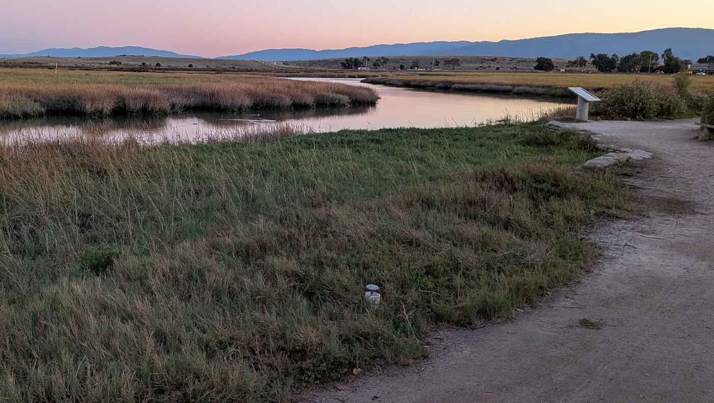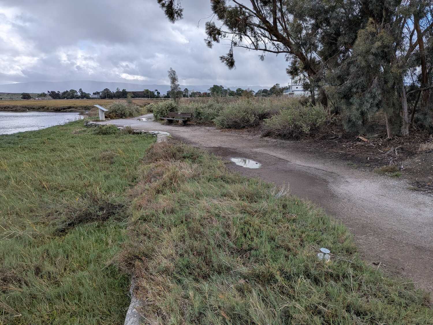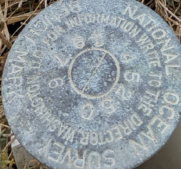 The City of Palo Alto's Creek Monitor and Camera page includes a Creek Monitor image that has the tide level measured at the Flood Basin Tide Gate Structure which is located 220 yards south of the southernmost end of the Baylands Sailing Station dock. Tide predictions we are all familiar with are given relative to Mean Lower Low Water (MLLW). The MLLW is the average of the level of each day's low tide and is assigned to be 0 ft. The reported "Tide" level in the Creek Monitor image is not relative to the MLLW level but some other reference that I have not tracked down. Fortunately I found a National Ocean Survey Bench Mark and was able to use it to calibrate the Creek Monitor Image tide levels. The Survey Bench Mark is located about 380 feet north east of the old Sea Scout building. This building is now now known as the Environmental Volunteers EcoCenter. The next four images below show the Survey Bench Mark and its location.